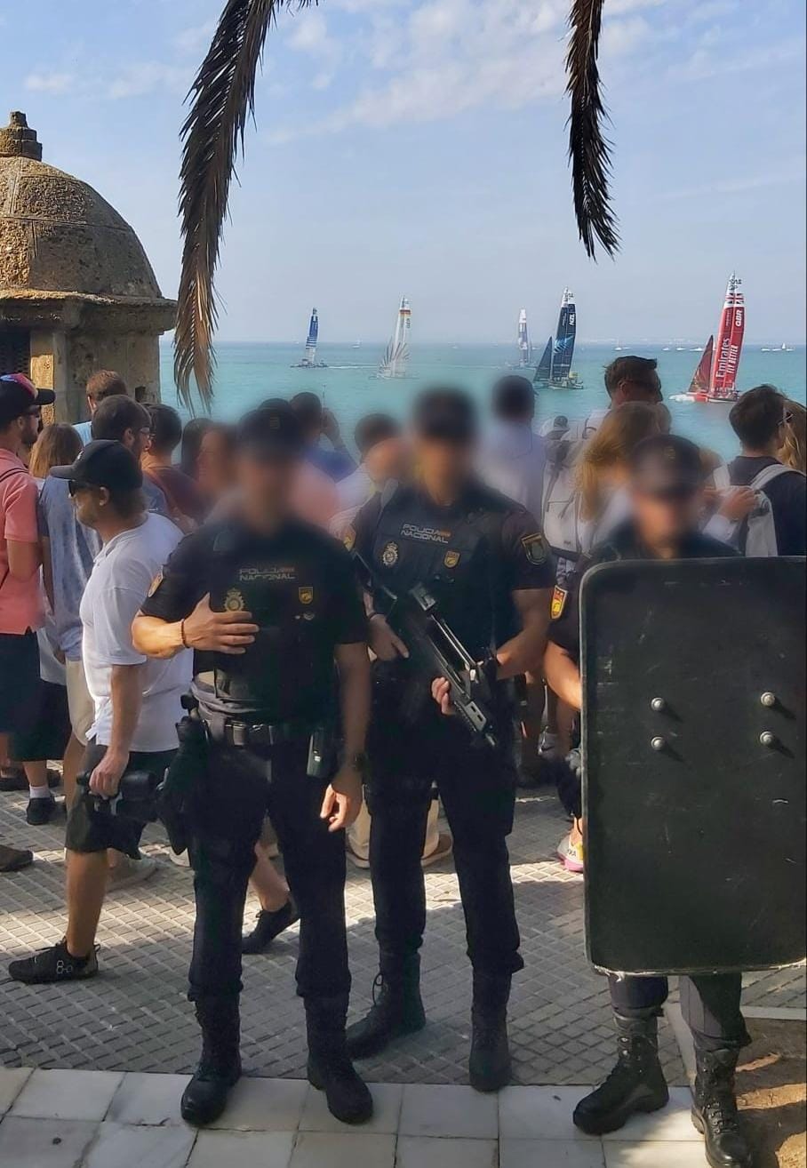 Agentes de la Policía Nacional participan en el dispositivo de seguridad con motivo de la SAILGP que se desarrollará durante los días 12 y 16 de octubre en Cádiz. La mayor parte de los efectivos desplegados son agentes especializados en seguridad ciudadana, siendo las Unidades de Prevención y Reacción las responsables de garantizar el correcto desarrollo de los actos y la seguridad de los asistentes.