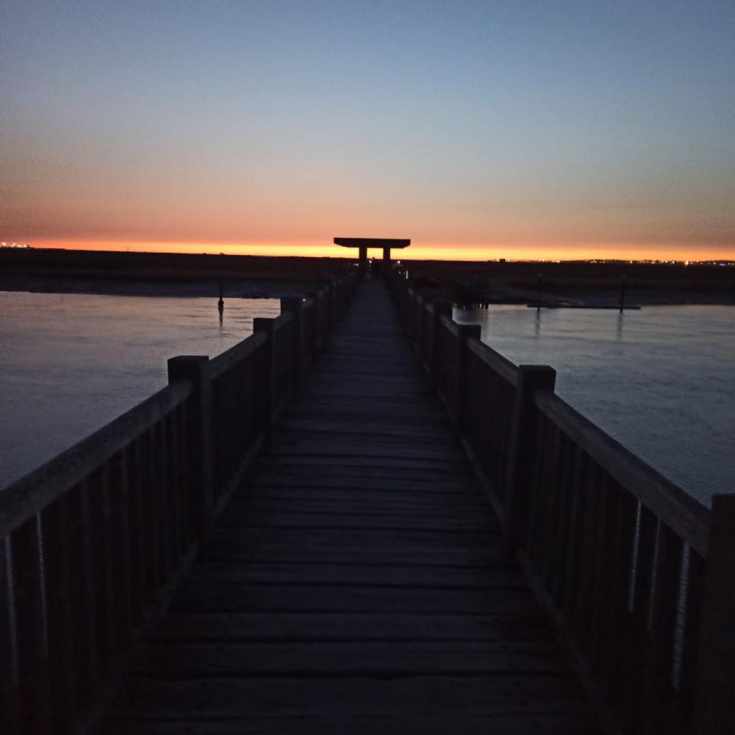 Una vez atravesada La Algaida, se tomará el carril bici que va al Caño de La Cortadura hasta la glorieta que está frente al campo de fútbol del Río San Pedro donde habrá parada y avituallamiento. La vuelta al Ceaan se realizará atravesando el gran puente de madera para contemplar la luna de la fresa y su reflejo sobre el río.