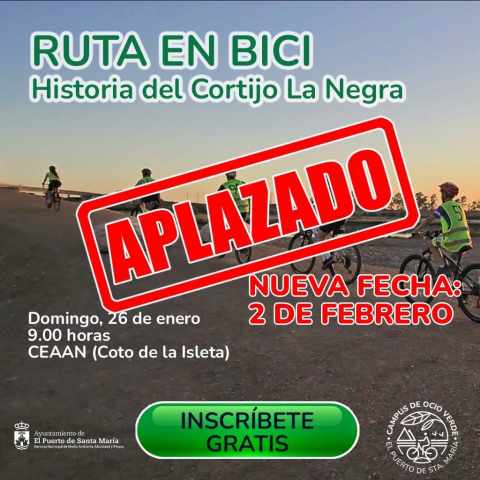El Servicio Municipal de Medio Ambiente y Movilidad del Ayuntamiento de El Puerto de Santa María, a través del Campus de Ocio Verde, organiza para este domingo 2 de febrero, a partir de las 09.00 horas, una nueva ruta en bici. En esta ocasión, se abren 50 plazas dirigidas a un público familiar, a partir de 10 años de edad, para alcanzar una de las fincas agrícolas históricas de la ciudad: el “Cortijo La Negra”, un enclave cuya bonita historia se remonta hasta el siglo XV, centuria en la que se produjo la Conquista de Granada, en la que participó su entonces propietario, Luis de Espínola y Contreras.