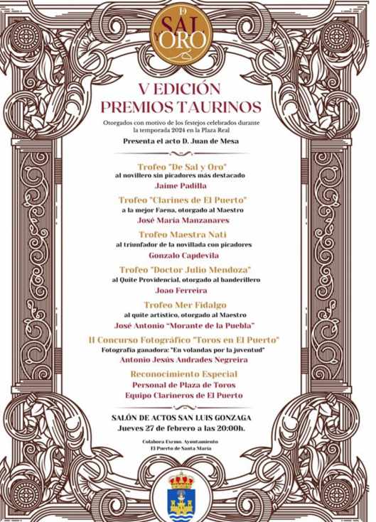 El próximo jueves 27 de febrero a las 20:00 horas se celebrará en el Salón de Actos San Luis Gonzaga la entrega de la V Edición de los Premios Taurinos De Sal y Oro, otorgados con motivo de los festejos celebrados durante la temporada 2024 en la Plaza Real. El acto será presentado por Juan de Mesa y con la colaboración del Ayuntamiento de El Puerto de Santa María.