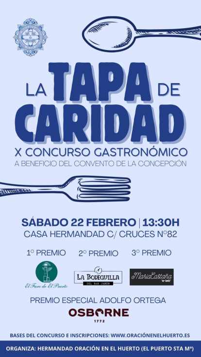 La Hermandad de la Oración en el Huerto de El Puerto de Santa María organiza la X edición del concurso gastronómico LA TAPA DE CARIDAD, que tendrá lugar el próximo 22 de febrero de 2024 a partir de las 13.30 horas en la misma Casa de Hermandad.