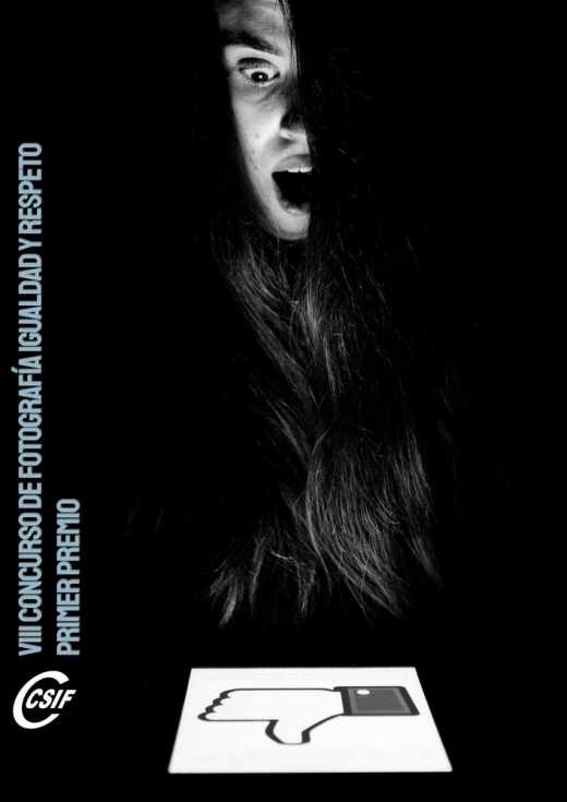 ‘Mujer y redes sociales’, de Francisco Javier Domínguez, de Jerez de la Frontera, ha resultado ganadora del VIII Concurso de Fotografía Igualdad y Respeto, que organiza la Unión Provincial de CSIF Cádiz a través de su secretaría de Responsabilidad Social e Igualdad. Una imagen en la que aparece el rostro de una mujer en claroscuro asombrada (o interpretando cualquier otra consecuencia emocional) ante el icono típico de aceptación en las redes sociales (el like). El jurado ha valorado la composición artística, la técnica y el mensaje que transmite la imagen al subrayar la importancia que tiene la comunicación y la dependencia de la imagen pública para muchas mujeres.