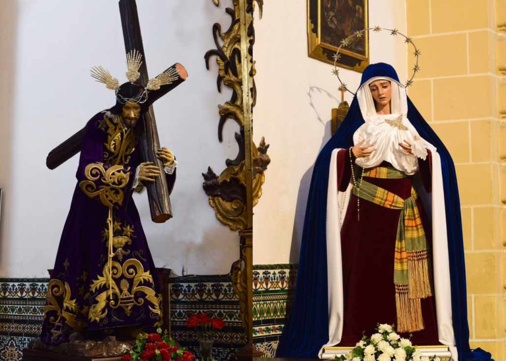Cabe recordar que el pasado martes 25 de febrero, el vestidor José Antonio Moreno Bernal, junto con la Camarista de la Hermandad, llevó a cabo el cambio de vestimenta de los Venerados Titulares con motivo de la Cuaresma. Nuestro Padre Jesús de Los Afligidos viste una túnica de terciopelo morado con bordados en hilos de oro, obra del bordador gaditano Lorenzo Guttemberg, donada en 1990 por la cuadrilla de hermanos costaleros. Asimismo, luce las potencias de plata “Sacramentales” estrenadas en la Pascua de 2023, realizadas en el taller sevillano de Orfebrería Castilleja según diseño de NHD José Mª Fernández Galván. María Santísima del Rosario en sus Misterios Dolorosos, siguiendo la tradición en esta época del año, aparece ataviada de hebrea. Luce una saya de terciopelo burdeos, manto de terciopelo azul con vueltas blancas confeccionado en 2021 por las hermanas de la Hermandad, fajín hebraico en tonos verdes, pañuelo de encaje de bolillos y rostrillo de raso blanco. El conjunto se completa con la aureola de plata y el puñal de plata sobredorada con incrustaciones de pedrería, donado en 1999 por el taller sevillano de Orfebrería Mallol.