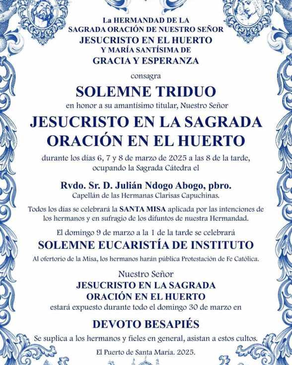 La Hermandad de la Sagrada Oración de Nuestro Señor Jesucristo en el Huerto y María Santísima de Gracia y Esperanza convoca a sus hermanos y fieles devotos a la celebración del solemne triduo en honor a su titular, nuestro Señor Jesucristo en la Sagrada Oración en el Huerto.