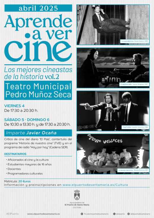 La Concejalía de Cultura anuncia la celebración del curso “Aprende a ver cine: los mejores cineastas de la historia (Vol. 2)”, que impartirá el prestigioso crítico cinematográfico Javier Ocaña en el Teatro Municipal Pedro Muñoz Seca. Durante tres días, 4, 5 y 6 de abril, este reputado crítico de cine del diario “El País” enseñará a ver el cine de otro modo, a disfrutarlo con más conocimiento de causa. Un curso que tiene un precio de 20 euros y en el que, a partir del próximo lunes 10 de marzo, se podrán informar y preinscribir todos aquellos que aman el séptimo arte a través de este enlace