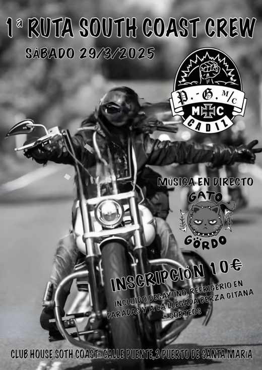 El próximo sábado 29 de marzo de 2025, los amantes de las dos ruedas tienen una cita ineludible en la 1ª Ruta South Coast Crew, organizada por el PGMC Cádiz. Este evento promete una jornada llena de adrenalina, compañerismo y diversión para todos los participantes.
