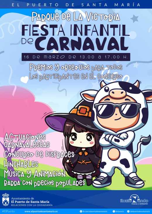 La Concejalía de Relaciones con la Ciudadanía del Ayuntamiento de El Puerto de Santa María informa que la Gran Fiesta Infantil de Carnaval, inicialmente prevista para el pasado domingo y que no pudo celebrarse por la climatología, ha sido reprogramada para este domingo 16 de marzo en el Parque de La Victoria, a partir de las 13:00 horas.