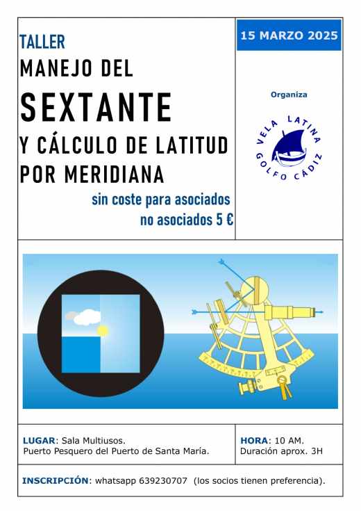 El pasado 15 de marzo, la Asociación Cultural para la recuperación de la Vela Latina en el Golfo de Cádiz dio inicio a su ciclo de talleres de 2025 con la actividad Manejo del Sextante y Cálculo de la Latitud por Meridiana. La sesión permitió a los asistentes practicar la toma de alturas con el sextante y realizar los cálculos necesarios para determinar la latitud, despertando un gran interés que superó todas las expectativas.