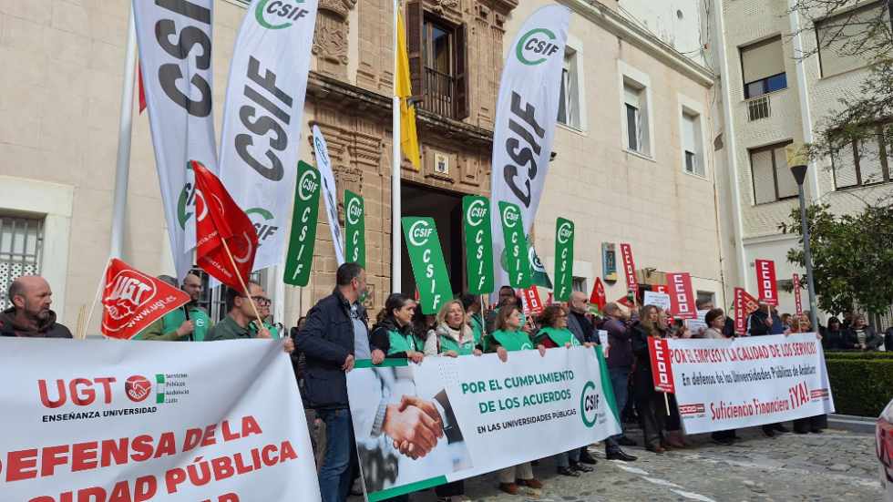 CSIF, que se ha concentrado junto a CCOO y UGT en las ocho provincias andaluzas (en Cádiz, en el Edificio del Hospital Real), ha exigido que se dé cumplimiento al Acuerdo firmado el 25 de junio de 2024 junto al consejero de Universidad, Investigación e Innovación y a la rectora y los rectores, que establecía mejoras económicas y el reconocimiento de derechos para las trabajadoras y los trabajadores de las universidades públicas. Entre las medidas establecidas en el acuerdo alcanzado por todas las partes, y que aún está pendiente de llevar a cabo, se encuentra el pago de los complementos autonómicos del personal docente e investigador (PDI), para lo que se han recibido más de 10.000 solicitudes en toda Andalucía (885 en la Universidad de Cádiz), así como el abono de la carrera horizontal del personal técnico, de gestión y de administración y servicios (PTGAS) de 2024 y 2025.