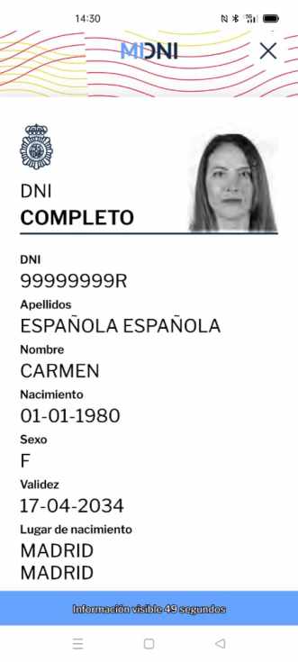 Una vez elegido el nivel de información solicitado, la aplicación genera un código QR que se muestra en la pantalla del teléfono del titular del DNI. Es un código generado por Policía Nacional, lo que asegura que los datos son auténticos en ese mismo momento, que permanecerá visible durante un corto período de tiempo para facilitar la verificación. Pasado este período, perderá su validez y será necesario generar un nuevo código.