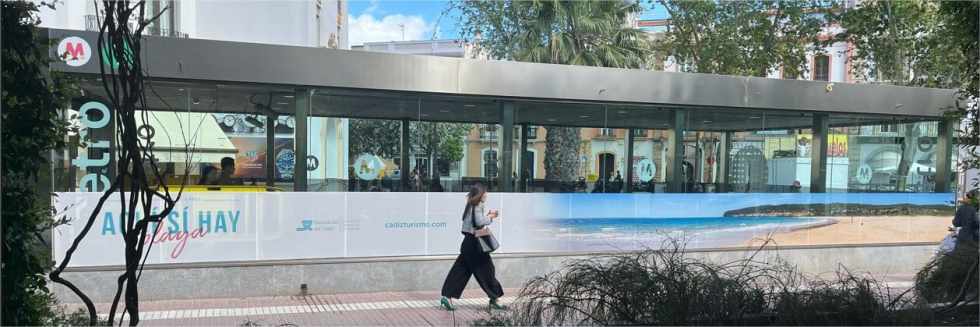 La céntrica estación de metro de Puerta de Jerez en la capital hispalense ya luce vinilos diseñados para la campaña, con fotos de playas de la provincia de Cádiz en todos los elementos tanto interiores como exteriores de esta estación de metro de gran trasiego de personas: templete y ascensor exterior, zócalos, escaleras de acceso, ascensor vestíbulo, barandilla, vestíbulo, escaleras entreplantas, andén, ascensor andén y puertas integrales de andén.