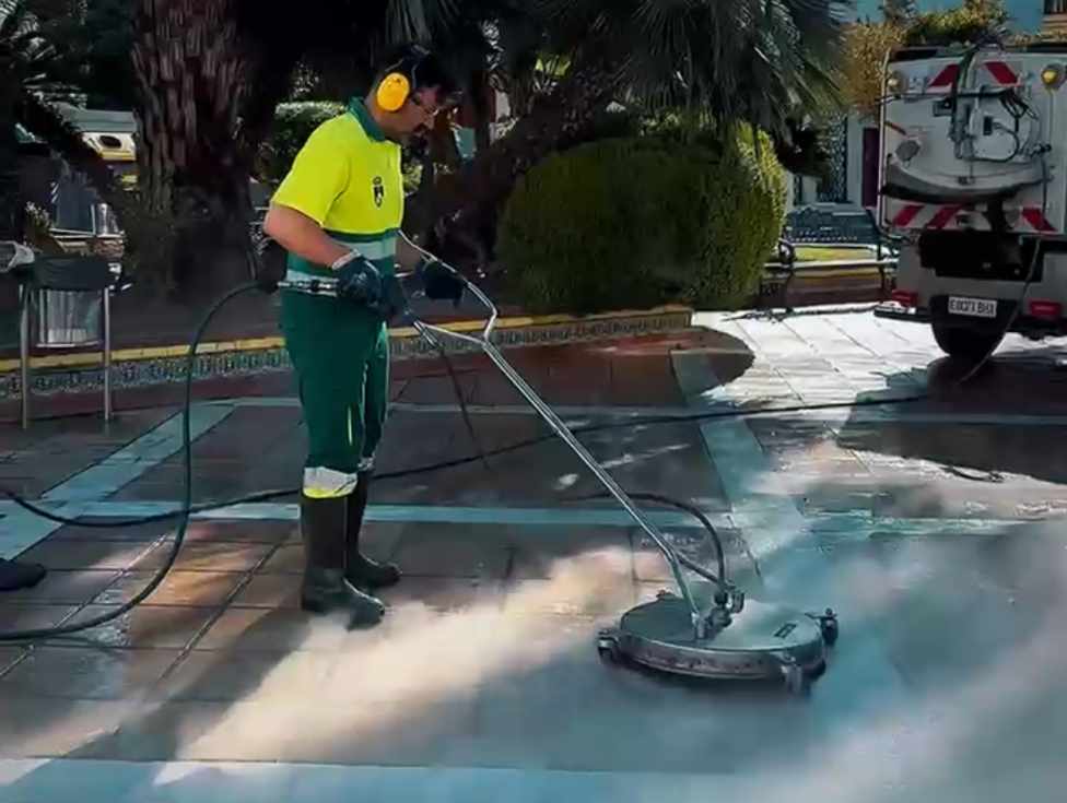 La maquinaria de última generación elimina los restos de cera de la Semana Santa en El Puerto