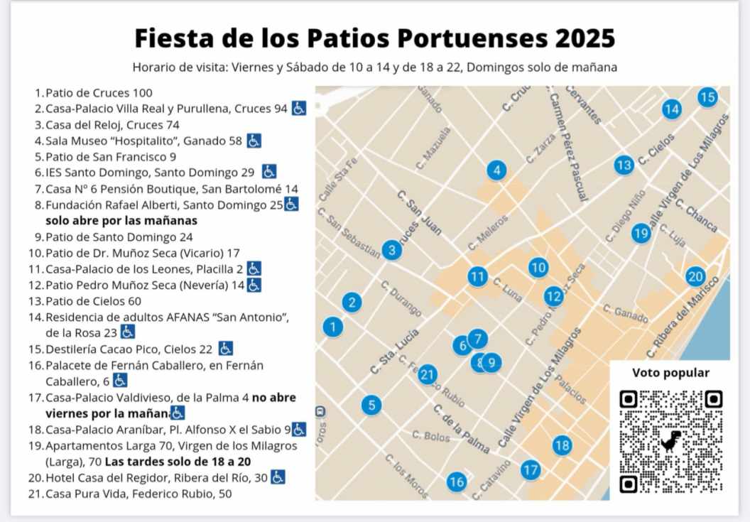 Cabe recordar que algunos patios tienen horarios especiales, como el Fundación Rafael Alberti, que solo abre por las mañanas, o los Apartamentos Larga 70, que recibirán visitas únicamente por las tardes de 18:00 a 20:00 horas.