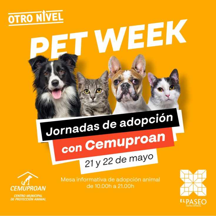 El Centro Municipal de Protección Animal (Cemuproan) celebra una nueva edición de la Pet Week los días 21 y 22 de mayo con unas jornadas de adopción muy especiales. El evento se desarrollará en el Centro Comercial El Paseo, que volverá a convertirse en punto de encuentro entre los ciudadanos y los animales que actualmente buscan un hogar en Cemuproan, ubicado en la calle Francisco Cossi Ochoa, 5.