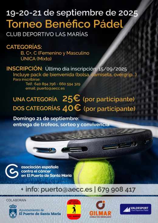 El Ayuntamiento de El Puerto de Santa María muestra su compromiso con la salud, el deporte y la solidaridad colaborando en la organización del Torneo Benéfico de Pádel que tendrá lugar los días 19, 20 y 21 de septiembre en el Club Deportivo Las Marías, a beneficio de la Asociación Española Contra el Cáncer (AECC) en El Puerto.