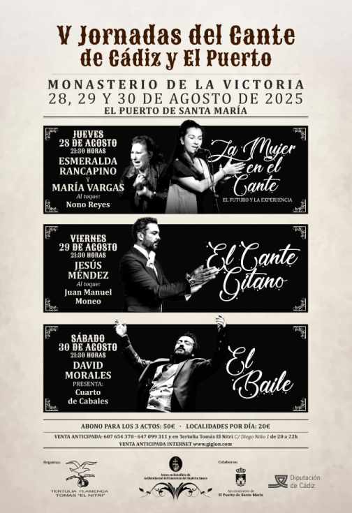 Este jueves 28 de agosto, a las 21:30 horas, darán comienzo las V Jornadas del Cante de Cádiz y El Puerto, una cita ya consolidada dentro del calendario cultural portuense que se celebrará hasta el sábado 30 en el claustro del Monasterio de la Victoria, junto a la estación de RENFE.