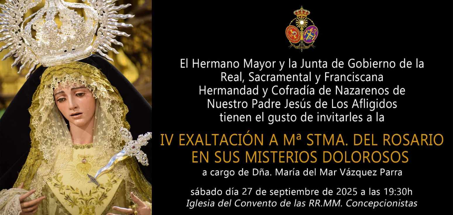 La Real, Sacramental y Franciscana Hermandad y Cofradía de Nazarenos de Nuestro Padre Jesús de los Afligidos organiza la IV Exaltación a María Santísima del Rosario en sus Misterios Dolorosos, un acto que tendrá lugar el sábado 27 de septiembre de 2025 a las 19:30 horas en la Iglesia del Convento de las RR.MM. Concepcionistas.