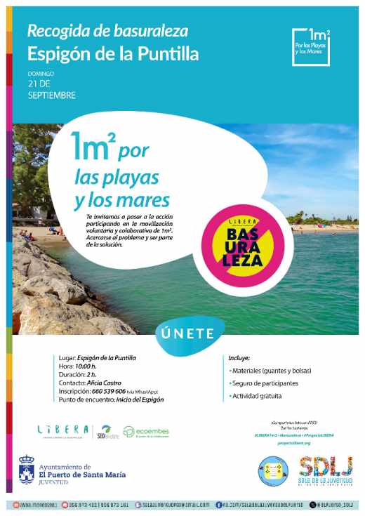 La concejalía de Juventud que encabeza José Ignacio González Nieto colaborará en una recogida de basura en el espigón de La Puntilla que tendrá lugar el domingo 21 de setiembre a partir de las 10 de la mañana. La duración de la actividad será aproximadamente de 2 horas. El lugar de encuentro se fija en el inicio del espigón de la Puntilla a la hora de comienzo de la actividad.