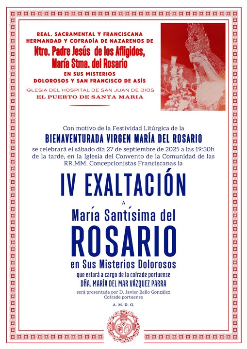 Ya el sábado día 27 de septiembre, a las 19:30h, se celebrará en la Iglesia del Convento de las RR.MM. Concepcionistas Franciscanas la IV Exaltación a María Santísima del Rosario en Sus Misterios Dolorosos, a cargo de la cofrade portuense María del Mar Vázquez Parra, la cual será presentada por Javier Bello González.