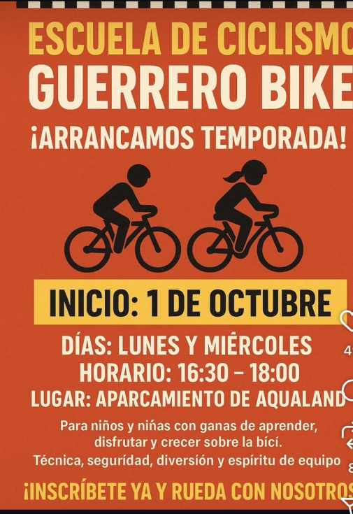 La Escuela, presidida por Guerrero, invita a niños y niñas a partir de los 4 años a participar en las concentraciones que se celebran los lunes y miércoles, de 16:30 a 18:00 horas, en el aparcamiento próximo a Aqualand. El campeón destaca que la actividad está enfocada a la “técnica, seguridad, diversión y espíritu de equipo”, y pensada para que los pequeños “disfruten, aprendan y crezcan en el ciclismo”.