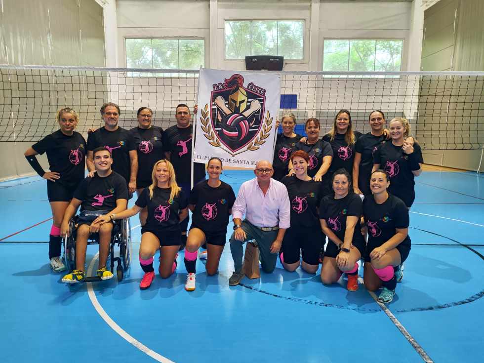 El concejal de Deportes del Ayuntamiento de El Puerto de Santa María, José Ignacio González, ha visitado esta mañana al grupo mixto de jugadores veteranos Voleibol La Élite, formado por antiguos integrantes del histórico Club Voleibol Poullet.