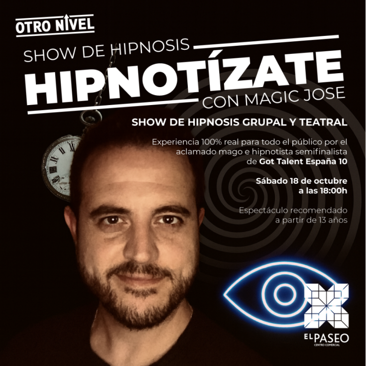 El centro comercial El Paseo invita a vivir una experiencia inolvidable el próximo sábado 18 de agosto con ‘¡Hipnotízate!’, el sorprendente espectáculo de hipnosis grupal y teatral del mago e hipnotista Magic Jose. Con una trayectoria de más de 17 años como profesional de la magia y nueve dedicados a la hipnosis, este artista gaditano —semifinalista de Got Talent España y premiado en múltiples certámenes nacionales y europeos— llega a El Paseo para demostrar que la hipnosis es tan real como divertida.