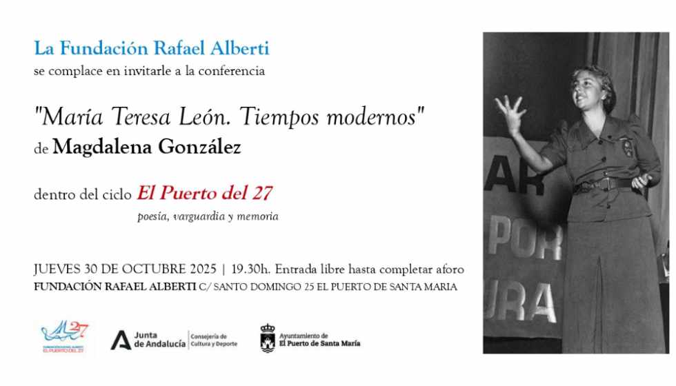 La conferencia, titulada “María Teresa León. Tiempos modernos”, correrá a cargo de la profesora e investigadora Magdalena González. Esta cita coincide además con el aniversario del nacimiento de María Teresa León (31 de octubre de 1903), por lo que constituye también un acto de homenaje y celebración.