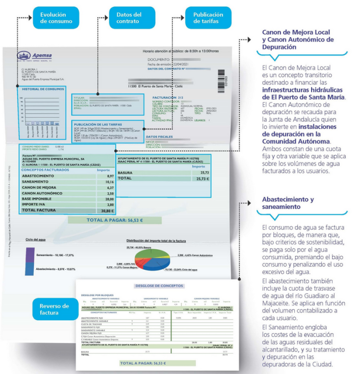 El abastecimiento incluye también la cuota de trasvase, un concepto que se recauda para pagar por el trasvase de agua desde el río Guadiaro-Majaceite al Pantano de los Hurones, desde donde el Consorcio de Aguas de la Zona gaditana le suministra el agua potable a El Puerto de Santa María y otras poblaciones de la provincia.
