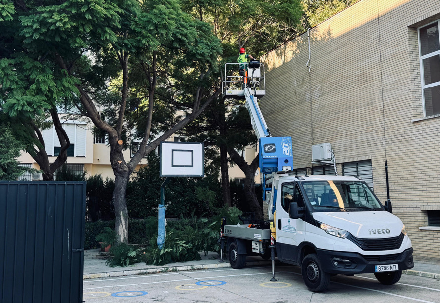 Los trabajos, que tendrán una duración aproximada de dos meses, forman parte del mantenimiento programado en los distintos centros educativos del municipio. Tras el CEIP Menesteo, las actuaciones continuarán en los colegios públicos La Gaviota, José Luis Poullet, Cristóbal Colón y Pinar Hondo, donde se realizarán podas de mantenimiento en árboles y palmeras, así como la tala de ejemplares en mal estado o decrepitos.