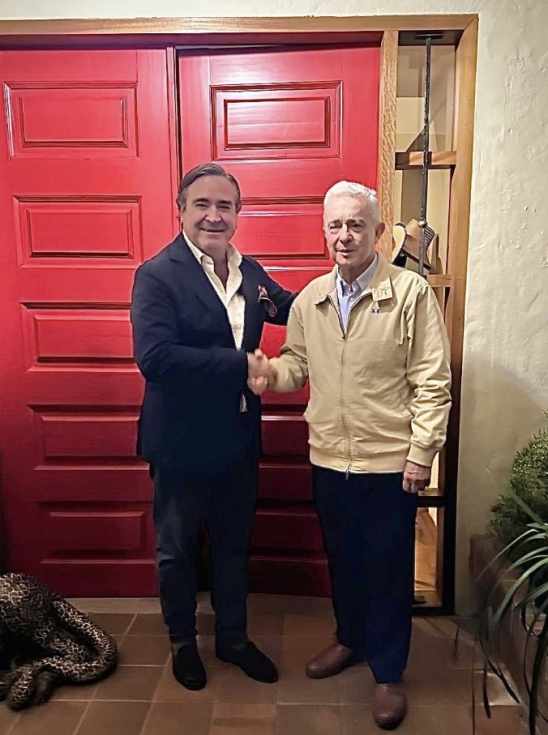 Las fotografías, tomadas frente a la emblemática Puerta Roja de la residencia del presidente Uribe, muestran un momento de cordialidad y afecto en torno a una canción que ha marcado la memoria emocional de Colombia.