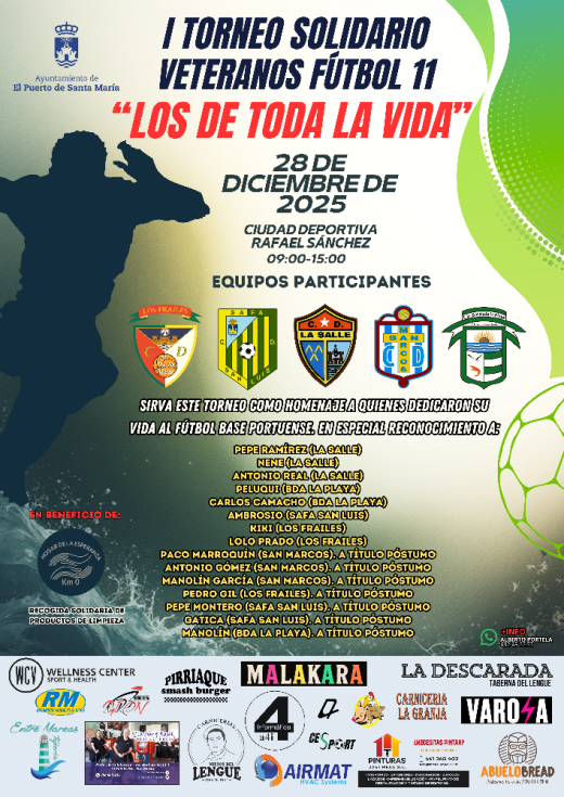 La Ciudad Deportiva Rafael Sánchez será el escenario, el próximo 28 de diciembre de 2025, del I Torneo Solidario de Veteranos de Fútbol 11 “Los de Toda la Vida”, un evento que reunirá a algunos de los equipos más históricos y representativos de El Puerto de Santa María.