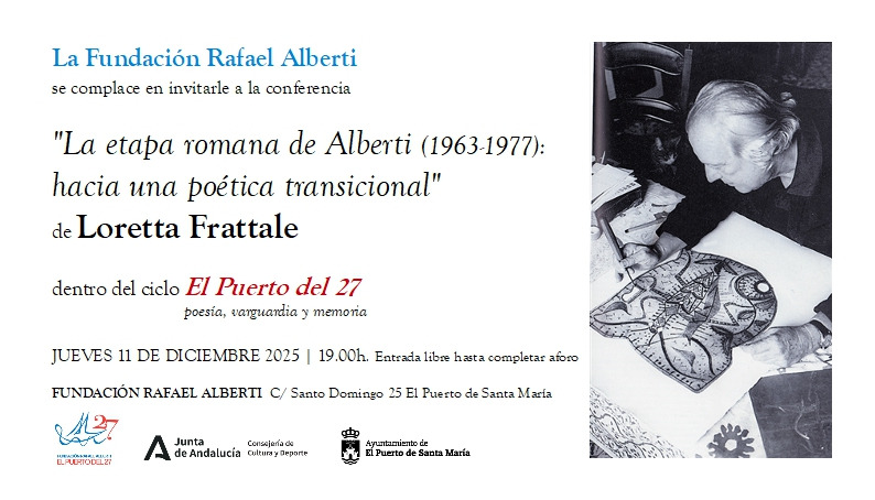 La Fundación Rafael Alberti celebrará el próximo jueves 11 de diciembre, a las 19:00 h, en su sede de El Puerto de Santa María, una nueva conferencia dentro del ciclo “El Puerto del 27, poesía, vanguardia y memoria”, un programa que conmemora el centenario de la Generación del 27 y que se desarrollará hasta diciembre de 2027.