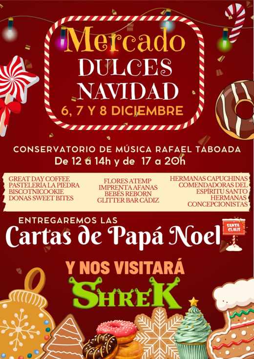 Entre los participantes se encuentran artesanos y expositores locales como Great Day Coffee, Pastelería La Piedra, Biscotnicookie, Donas Sweet Bites, Flores Atemp, Imprenta Afanas, Bebés Reborn, Glitter Bar Cádiz, además de diversas comunidades religiosas de la ciudad. Un espacio familiar en el que, además, los más pequeños pueden entregar sus cartas a Papá Noel y disfrutar de la visita de personajes como Shrek, que llenan de fantasía el recorrido y generan una gran atracción de público.