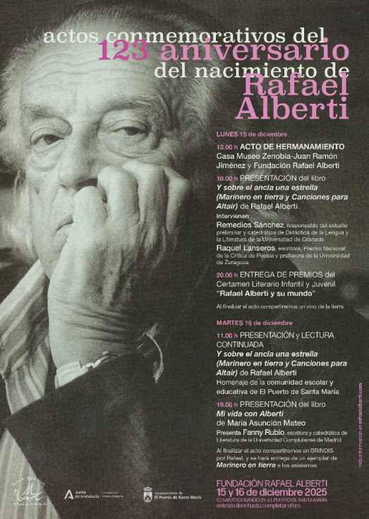La Fundación Rafael Alberti celebra los días 15 y 16 de diciembre los actos conmemorativos del 123 aniversario del nacimiento de Rafael Alberti, con un programa cultural que reúne literatura, pensamiento, memoria y creación poética contemporánea en la sede de la Fundación, situada en la calle Santo Domingo, 25.