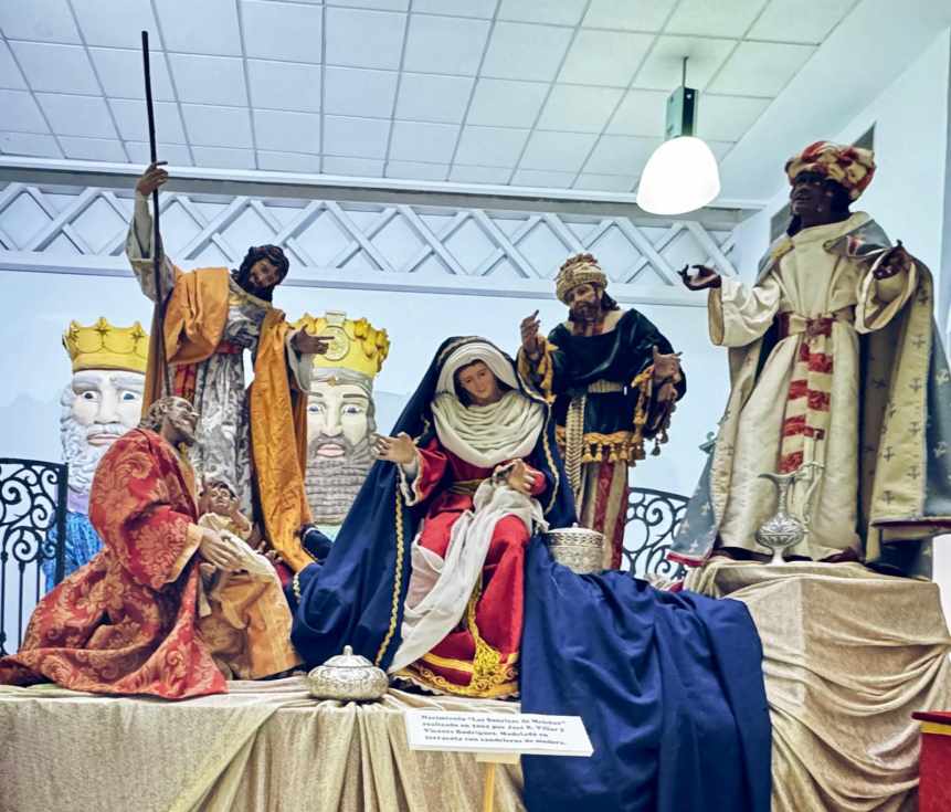 El recorrido exhibe piezas de Vicente Rodríguez, José Ramón Villar y Adrián Ferreras, cuyo dibujo inspiró los tres grandes Reyes Magos que presiden la pared del fondo, modelados junto a Rodríguez. También se muestra el nacimiento “Las sonrisas de Melchor” (2022), obra de Villar y Rodríguez, realizado en terracota con candeleros de madera; un nacimiento costumbrista de José Ignacio Mateos Atalaya; figuras en poliestireno como Ding Dong, Marshall (Patrulla Canina), Shrek u Olaf; y diverso material gráfico que recuerda colaboraciones con misas pontificales —como la del centenario de la Coronación de la Virgen de los Milagros—, así como con casetas de Feria, carrozas de Reyes, Carnaval o Halloween. No falta tampoco el atrezzo de Balbo Teatro.