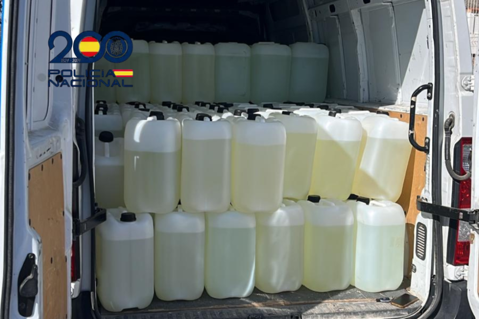 En la inspección del vehículo, los agentes localizaron en su interior un total de 75 garrafas de 25 litros cada una, lo que supone aproximadamente 1.875 litros de combustible. El hallazgo revestía especial gravedad, ya que la furgoneta se encontraba estacionada en una calle residencial habitada, con el combustible almacenado en condiciones precarias y superando ampliamente cualquier límite de consumo doméstico, lo que suponía un riesgo real e inminente para la seguridad ciudadana. Ante esta situación, los agentes trasladaron el vehículo con extremas medidas de seguridad hasta dependencias policiales, procediéndose a la detención de los cuatro implicados.