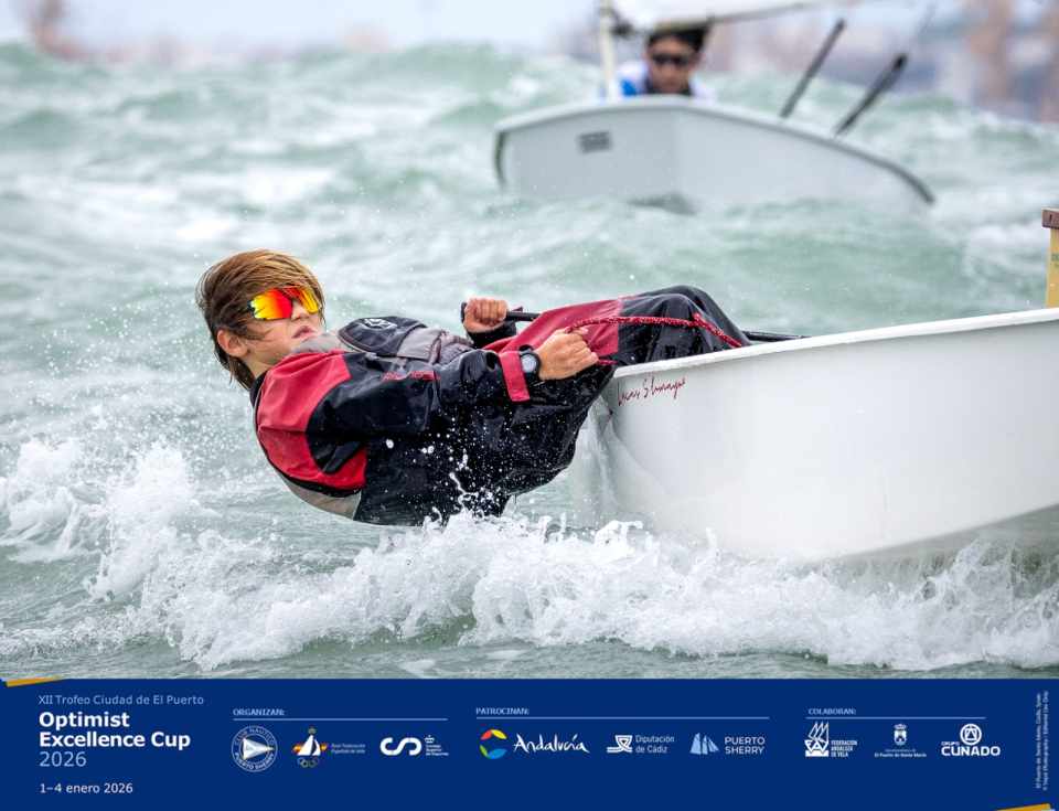 La 12ª Regata Ciudad del Puerto, Trofeo Excellence Cup de Optimist, ha arrancado este viernes 2 de enero en aguas de la Bahía de Cádiz con una primera jornada especialmente dura, marcada por unas condiciones exigentes que pusieron a prueba a toda la flota. El viento sopló del 120º de dirección, de menos a más en intensidad, con una media de 17 nudos y rachas que alcanzaron los 23, acompañado de mar de fondo, fuerte corriente y roles, en un escenario que no permitió errores.
