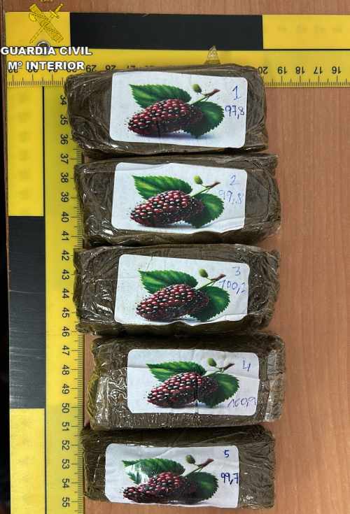 Durante el registro los agentes se percataron que el ocupante que viajaba en la parte trasera trataba de ocultar una bolsa de plástico, que una vez inspeccionada se localizó en su interior 5 tabletas de hachís que arrojaron un peso total de 500 gramos.