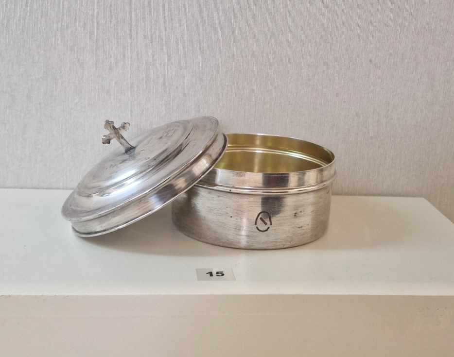 Desde el punto de vista técnico y formal, el estudio realizado por el arqueólogo José Manuel Lojo describe un recipiente de pequeño formato y morfología cilíndrica, con base plana y tapa ajustada ligeramente convexa, rematada por una cruz de la Santísima Trinidad que identifica claramente su función eucarística. Su diseño es sobrio y funcional, pensado para un uso frecuente y para facilitar su transporte en contextos asistenciales. Está elaborado en metal plateado, con el interior dorado, una solución habitual en la orfebrería litúrgica de finales del siglo XIX y principios del XX. En su fabricación se emplearon técnicas de embutición y torneado de lámina metálica, con una cruz realizada como elemento independiente y aplicada posteriormente a la tapa.