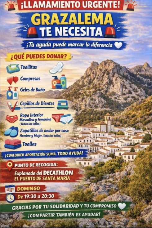 El municipio de Grazalema ha lanzado un llamamiento urgente a la solidaridad ciudadana ante la necesidad de productos básicos de higiene y primera necesidad, y ha sido el propio alcalde de El Puerto, Germán Beardo, quien desde sus redes sociales hace un llamamiento a los portuenses. Bajo el lema “Tu ayuda puede marcar la diferencia”, se ha organizado una recogida solidaria en El Puerto de Santa María para canalizar las donaciones hacia las personas afectadas.