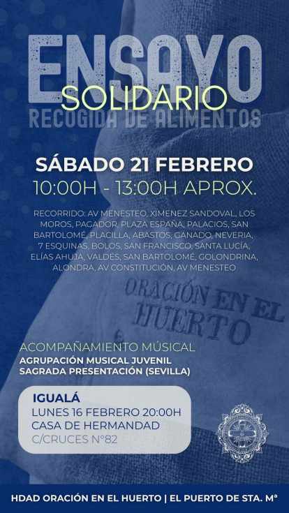 El Puerto de Santa María volverá a demostrar su carácter solidario el próximo 21 de febrero con motivo del ensayo solidario organizado por la Hermandad de la Oración en el Huerto, una iniciativa que tiene como finalidad la recogida de alimentos destinados a Cáritas Parroquial de Nuestra Señora de los Milagros.