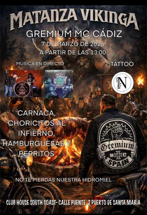 El club motero Gremium MC Cádiz celebrará el próximo 7 de marzo de 2026, a partir de las 13:00 horas, la denominada “Matanza Vikinga”, un evento que tendrá lugar en su sede Club House South Coast, situada en calle Puente, 2, en El Puerto de Santa María.