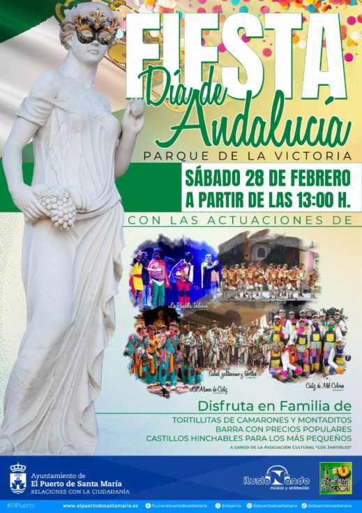 El próximo sábado 28 de febrero, con motivo del Día de Andalucía, el Parque de la Victoria se convertirá a partir de las 13:00 horas en el epicentro de una gran fiesta familiar pensada para disfrutar de la cultura, la gastronomía y la convivencia en un ambiente festivo y andaluz, una iniciativa que impulsa el Ayuntamiento de El Puerto de Santa María.