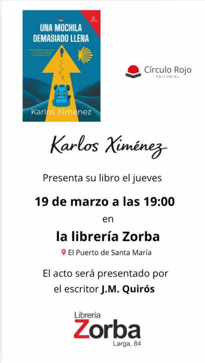 El Puerto de Santa María se prepara para una cita muy especial con la literatura y la emoción. Este jueves 19 de marzo, a las 19:00 horas, la librería Zorba (calle Larga, 84) acogerá la presentación de “Una mochila demasiado llena”, la primera novela de Karlos Ximénez, en un encuentro que promete ser mucho más que un acto literario.