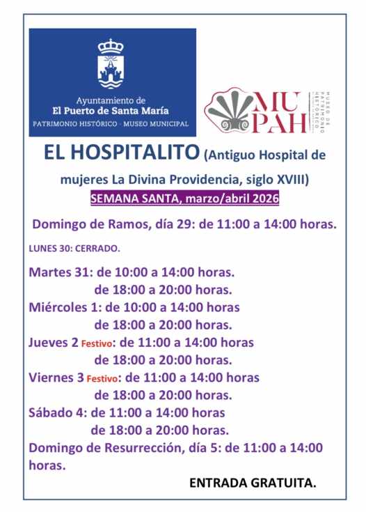 El Ayuntamiento de El Puerto de Santa María, a través de la concejalía de Patrimonio Histórico que dirige el teniente de alcalde Enrique Iglesias, informa de los horarios de apertura de la Sala Museo El Hospitalito con motivo de la Semana Santa 2026, facilitando así el acceso a este emblemático espacio cultural tanto a vecinos como a visitantes.