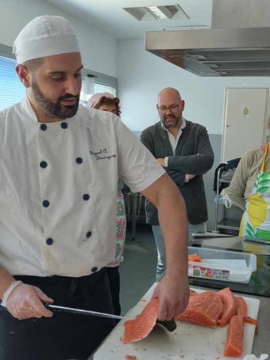 Miguel Ángel Domínguez Benítez, Jefe de Cocina en Sushitton, es el encargado de impartir la actividad. Con el Grado Superior de Cocina en la Escuela de Hostelería Fernando Quiñones, de Cádiz, y 9 años de experiencia docente, Domínguez enseña a los alumnos las elaboraciones de uramaki de salmón, futomaki de pollo crispy, nigiri flambeado con mayonesa japonesa, hosomaki de atún picante o maki de tartar picante. El docente subraya que el consumo calórico del sushi es mucho menor al de otros platos tradicionales de nuestra cocina, presentando también la ventaja de incorporar más nutrientes, con altos valores en proteínas y minerales, de manera que es una comida que sacia pero que no pesa. Miguel Ángel Domínguez destaca el nivel de entusiasmo que observa en sus alumnos portuenses, que muestran una gran involucración con la actividad.