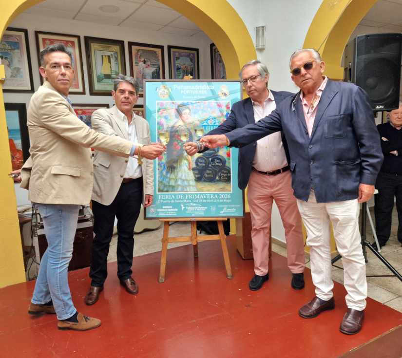 La Peña Madridista Portuense ha presentado el cartel anunciador de su Caseta de Feria 2026, una obra realizada por José Antonio Terrada Sara, en un acto celebrado en la sede de la entidad, que congregó a numerosos socios. En el mismo participó el teniente de alcalde de Fiestas, David Calleja, junto al autor del cartel y el presidente de la Peña, Bernardo García.
